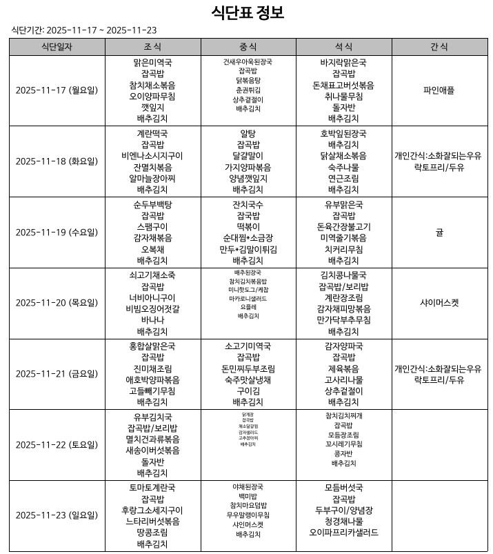 식단표(25.11.17.~25.11.23.) 입니다