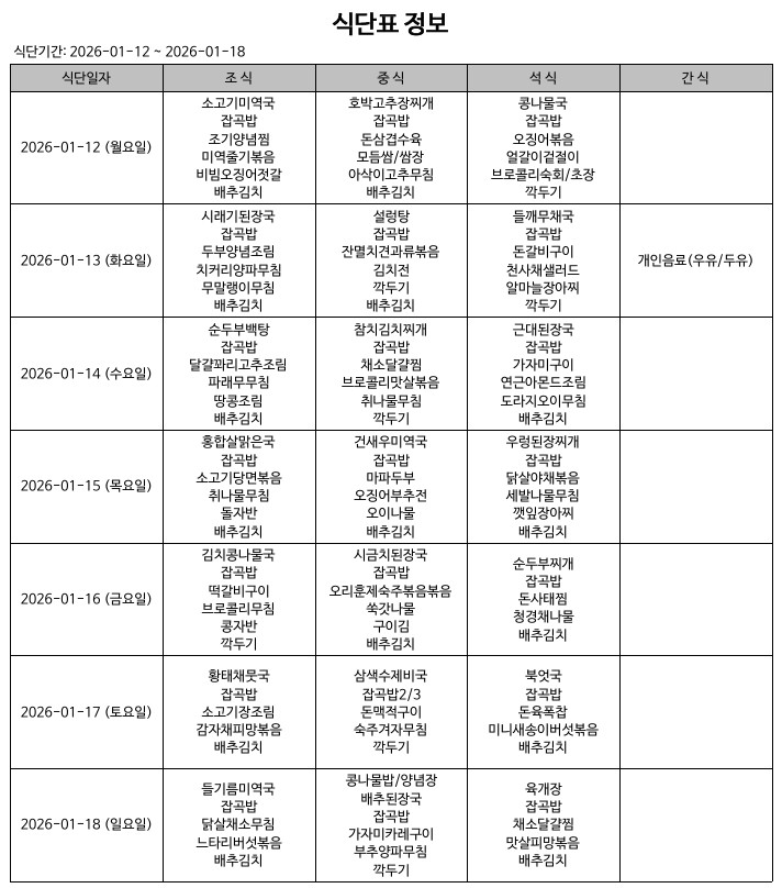 식단표(26.01.12.~26.01.18.)