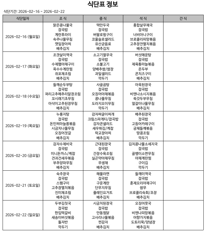 식단표(26.02.16.~26.02.22.) 입니다