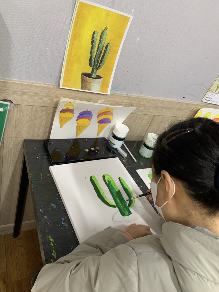 매주 수요일과 목요일에 입주자 정**, 천**, 윤** 님이 미술학원에서 진행되는 미술활동에 개별서비스로 참여하고 계십니다. 이번 시간에는 멋있는 선인장을 그려보는 시간을 가졌습니다. ^^