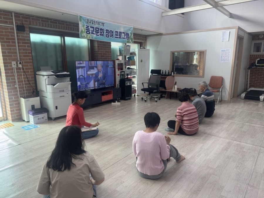 입주자분들과 함께 다목적실에 모여 TV로 종교 프로그램을 시청하였습니다. 성가대의 아름다운 찬송가를 들으며 마음을 평안하게 하고, 함께 기도드리며 뜻깊은 시간을 보냈습니다.
