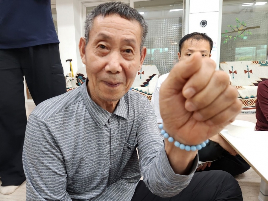 실에 비즈를 하나씩 넣어 예쁜 팔찌를 만들고 나서 손목에 껴보았습니다 ^^